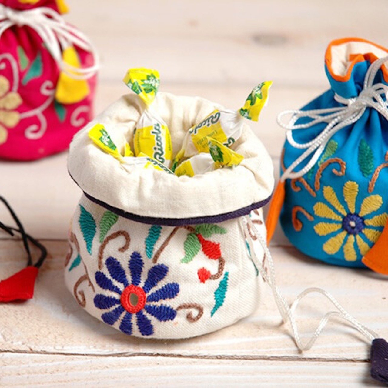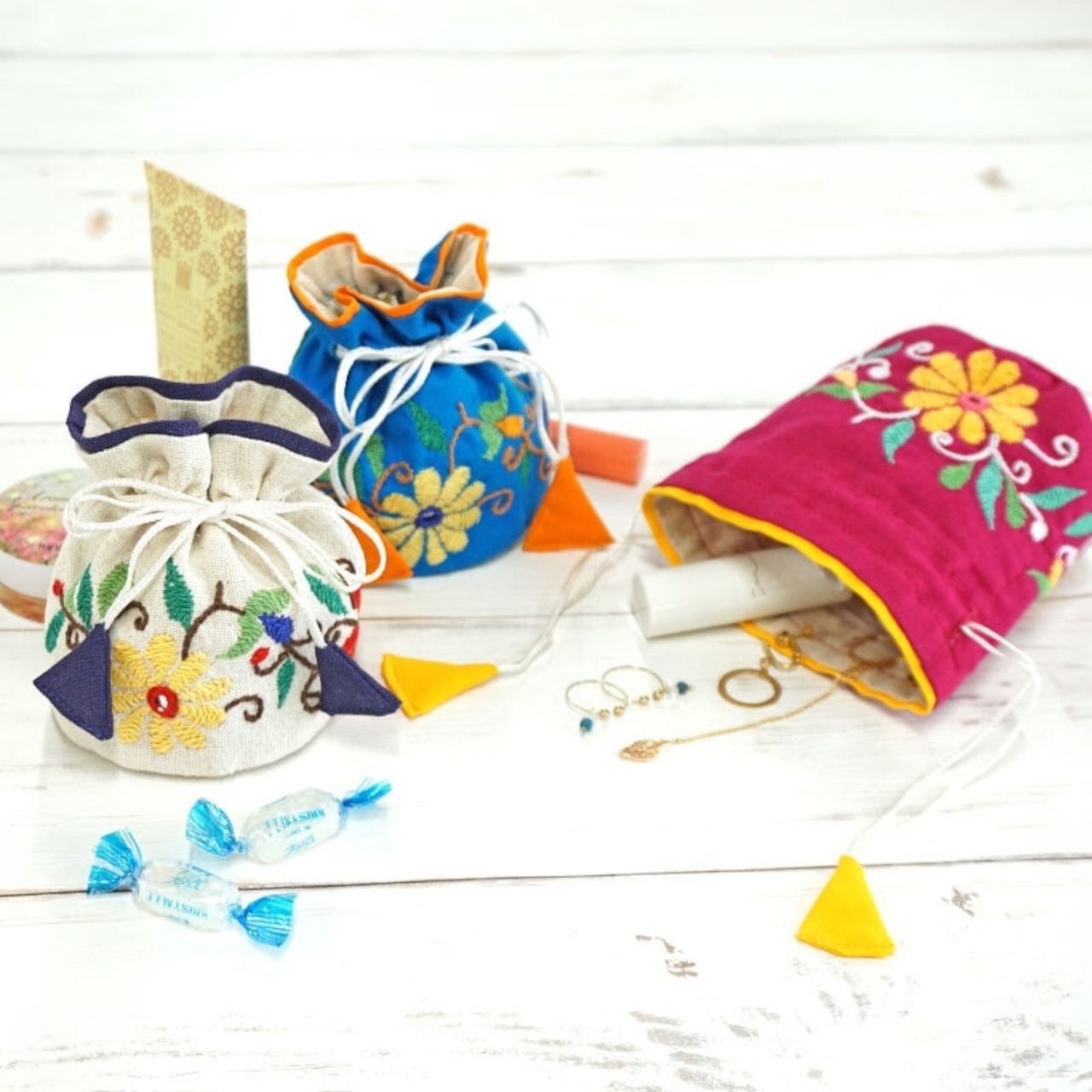お花の刺繍がかわいい手のひらサイズの巾着型ポーチです。