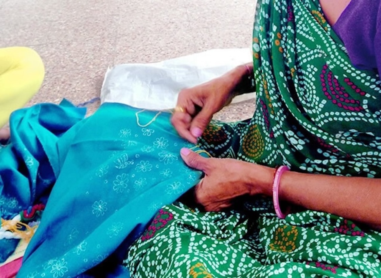 1つ1つ鏡を丁寧に縫いこんでいくミラー刺繍は、砂漠が広がるインド西北部グジャラート州の伝統的な刺繍です。